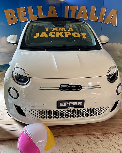 1) Besuche das Grand Casino Luzern und fotografiere das Fiat 500e Cabrio. Du findest das ausgestellte Auto im Foyer. Dort ist es in einer stilvollen, italienisch inspirierten Kulisse unter dem Motto «Bella Vita» zu sehen.